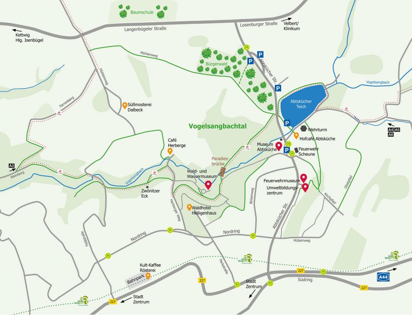 A 535 Richtung Velbert, dann A 44 Richtung Heiligenhaus, anschließend über die B 227 Richtung Rathaus bis zur Abtskücher Straße folgen.