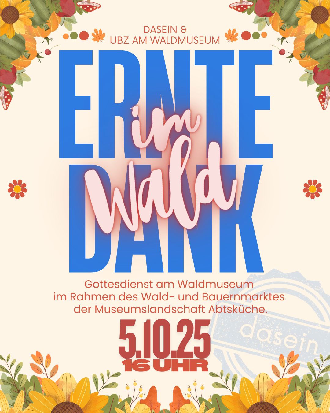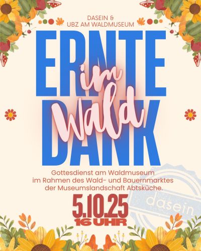 daesin & UBZ am Waldmuseum laden herzlich ein zum Erntedankgottesdienst am Waldmuseum im Rahmen des Wald- und Bauernmarktes. Eine Anmeldung ist nicht erforderlich, bringt gern eigene Getränke mit.