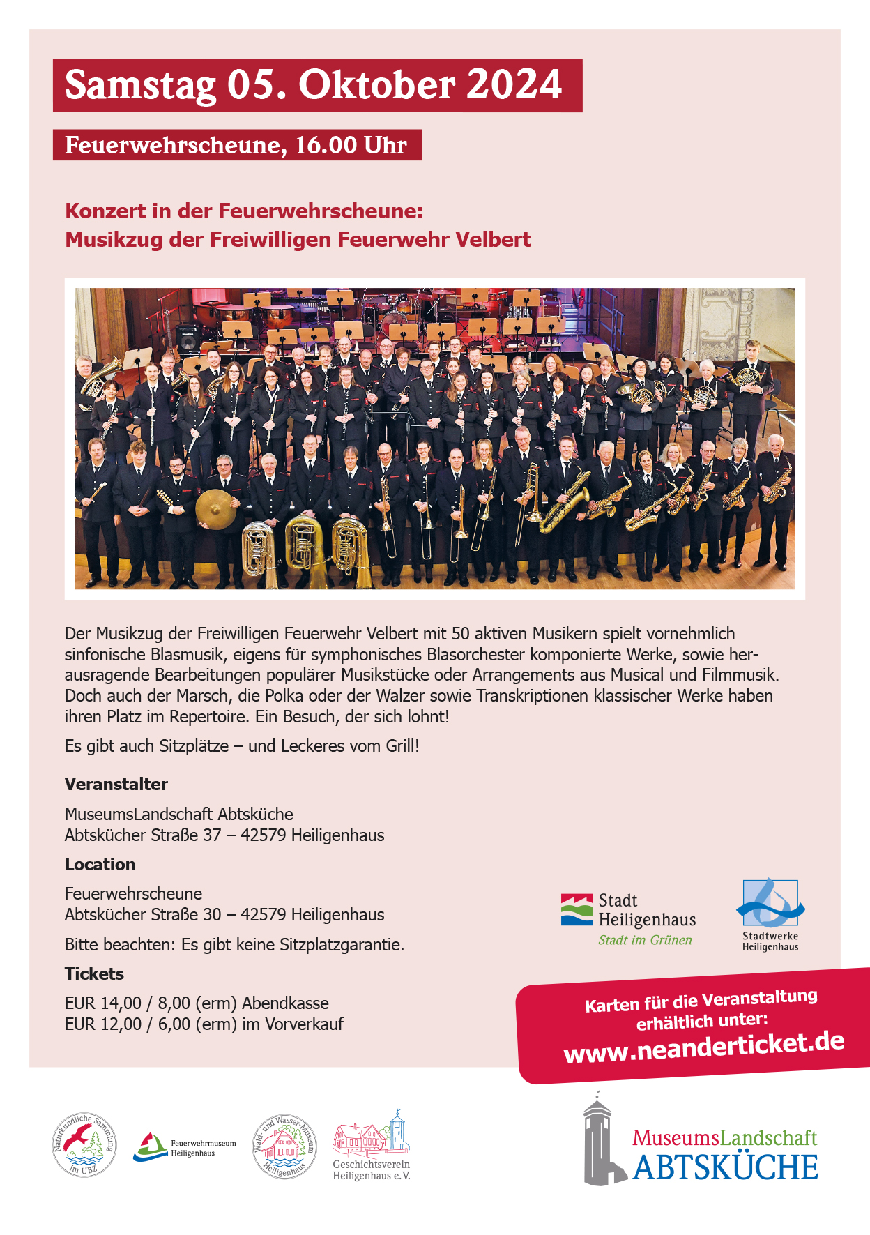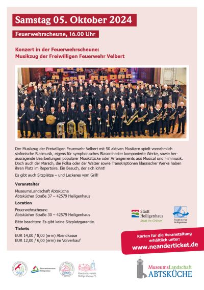 Der Musikzug der Freiwilligen Feuerwehr Velbert mit 50 aktiven Musikern spielt vornehmlich sinfonische Blasmusik, eigens für symphonisches Blasorchester komponierte Werke, sowie herausragende Bearbeitungen populärer Musikstücke oder Arrangements aus Musical und Filmmusik. Doch auch der Marsch, die Polka oder der Walzer sowie Transkriptionen klassischer Werke haben ihren Platz im Repertoire. Ein Besuch, der sich lohnt! Es gibt auch Sitzplätze - und Leckeres vom Grill!