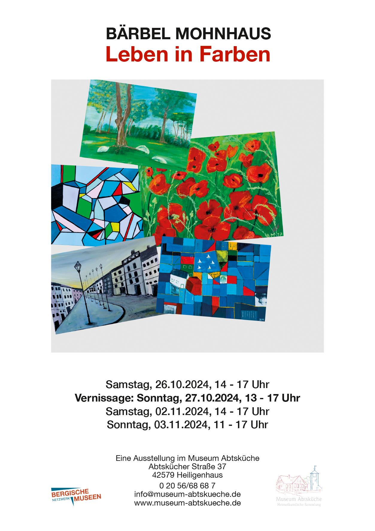 Das Museum Abtsküche, Heiligenhaus und der Geschichtsverein Heiligenhaus e.V. laden Sie, Ihre Familien und Freunde herzlich zum Besuch von Bärbel Mohnhaus‘ erster institutioneller Soloausstellung ein. Ein breites Spektrum farbiger und emotional betonter Malerei erwartet Sie.