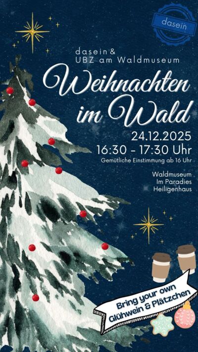 dasein & UBZ am Waldmuseum laden ein zu Weihnachten im Wald. Ab 16.00 Uhr könnt ihr zur gemütlichen Einstimmung vorbeikommen um dann mit uns von 16.30 bis 17.30 Uhr Weihnachten im Wald zu feiern. Bringt euch Plätzchen und Glühwein/Kinderpunsch mit!